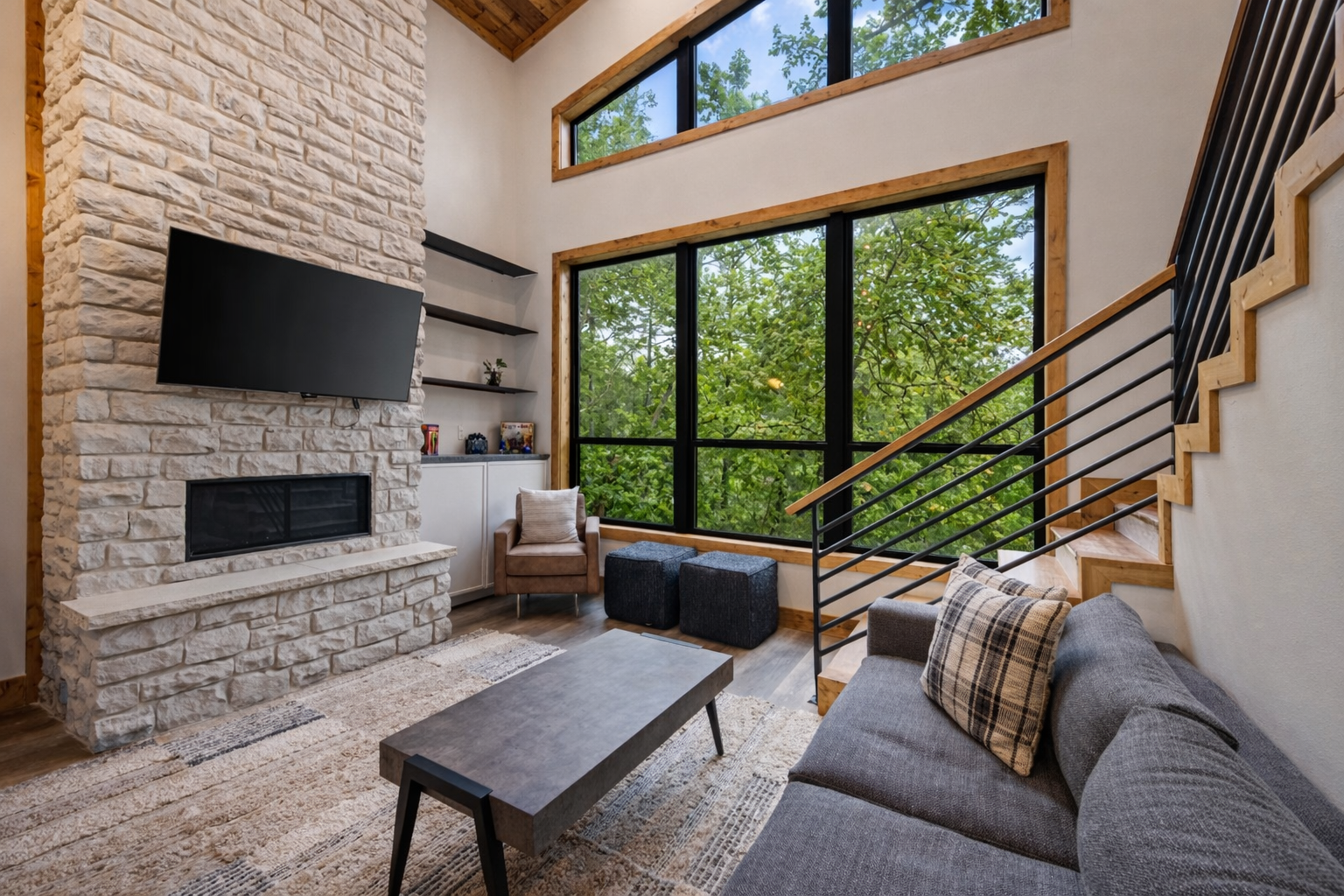 The cabin boasts spacious rooms, a beautifully appointed interior, all the modern amenities to make your stay comfortable. Relax in the cozy living area, hot tub overlooking the river, or the fireplace, or whip up a delicious meal in the fully equipped kitchen. TVs in each room & patio, washer/dryer, expansive windows, patio fire pit table, games, & many other amenities to make your stay enjoyable. Enjoy falling asleep to the soothing sounds of the river, & wake up refreshed, ready for another adventure.