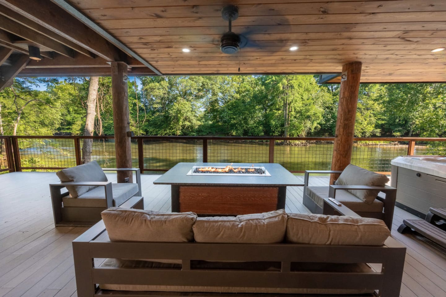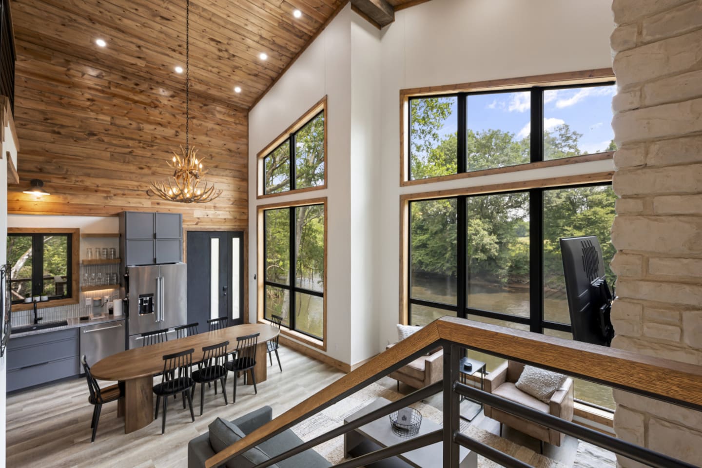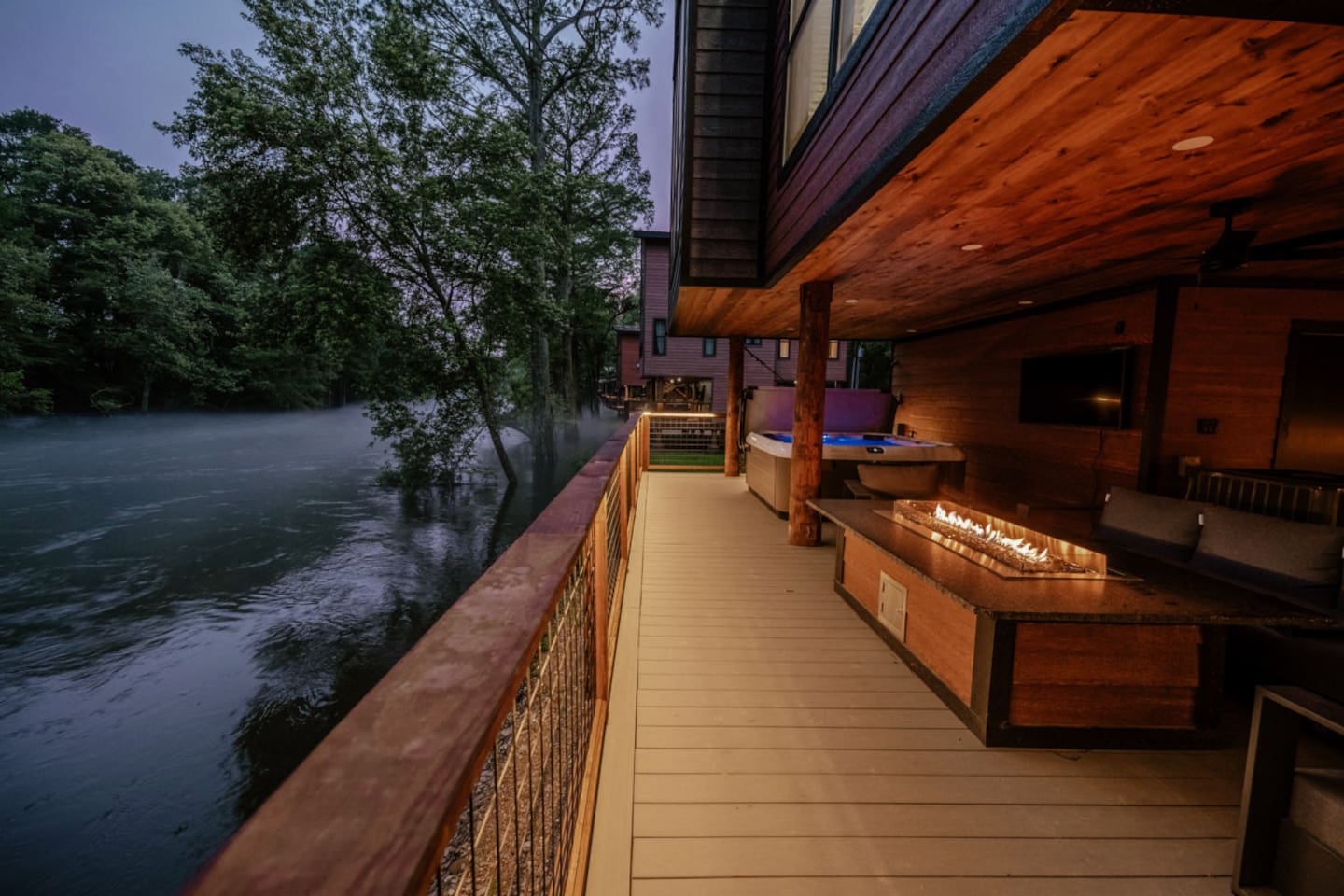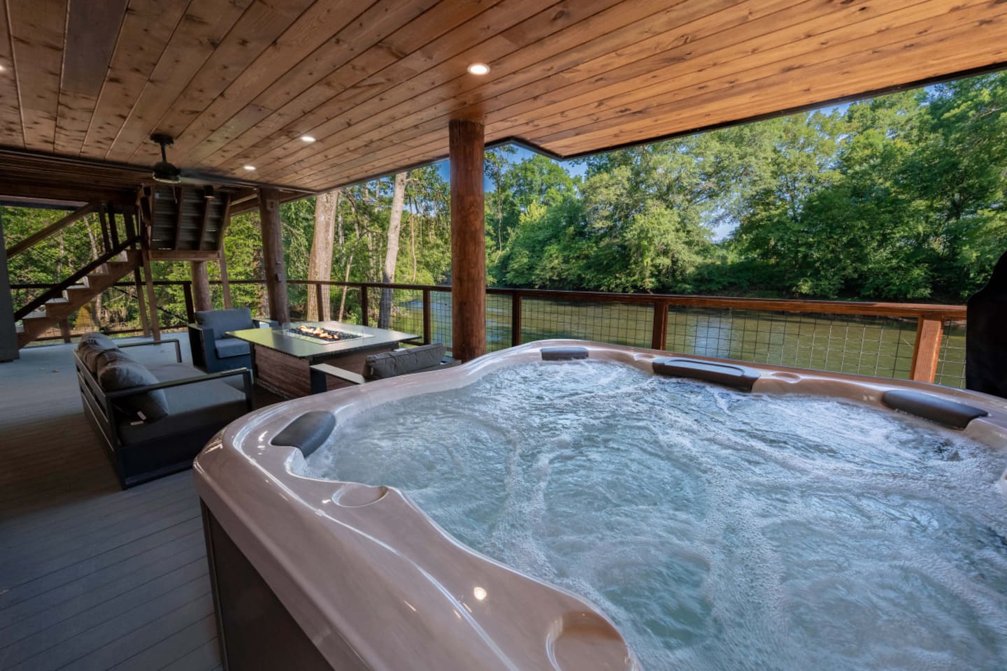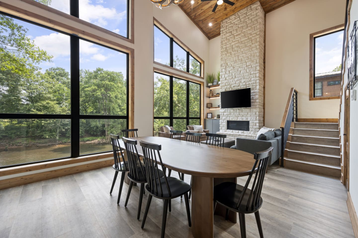 At Serenity Shores, you can expect to find generously sized rooms, a hot tub overlooking the river, TVs in each room, a washer and dryer, air conditioning and heating systems, expansive windows, as well as a patio featuring fire table, and many other amenities to make your stay even more comfortable and enjoyable.